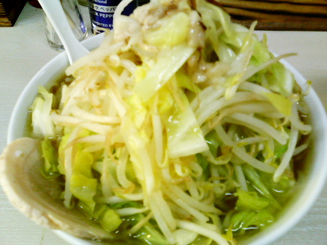 中にはいると・・・予想通り二郎系。野菜増しとニンニク増しがあり、麺大盛も無料。とりあえず、野菜のみ増しで注文しました。そしたら、これが出てきました。この野菜は、二郎の比じゃありませんよ(^^; 凄い量。麺が見えないどころではありません。