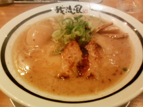 ラーメンは、豚骨でどちらかといえば熊本ラーメンに似た感じ。焦がしニンニクと焦がしネギがのっていて、プーンとニンニクの香りがします。豚骨のスープは、博多のような豚骨としてはあっさりのものではなく、かなりこってりって感じ。具では、チャーシューでなくて、豚トロなのが特徴的。