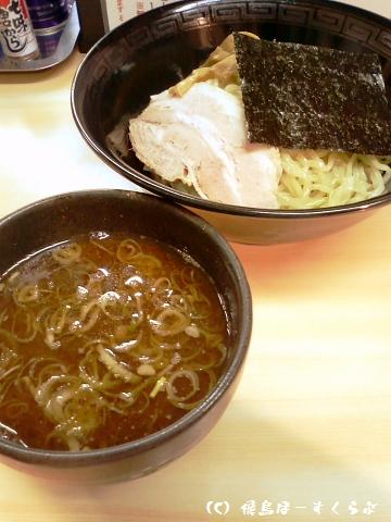 暑いし、つけ麺を食べることに。なんでも、つけダレは豚骨ベースの動物系スープと、煮干しなどの魚介系スープを合わせて、それに鶏や野菜を入れて調整したダブルスープなんだとか。出てくるとまず、魚介系スープの良い香りがします。一口啜ってみると、豚骨のコクと魚介系の香りが一度に来て、これは旨い!ただ、脂が多いことと、醤油があまり効いていなかったことが気になりました。つまり、味付けが薄いと感じた訳です。そこで、ほんの若干量酢を垂らしてみました。すると、全体にメリハリがついて、私の好みの味になりました。