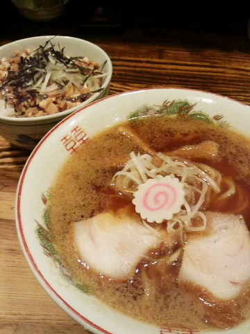 ラーメンと100円しか違わないのにネギチャー丼が付いてくるんです。これはお得ですよね。ということて、「ラーメンセット(¥700)」をいただきました。ちなみに、ごっちさんは、容赦なく「生ビールセット」をチョイスw