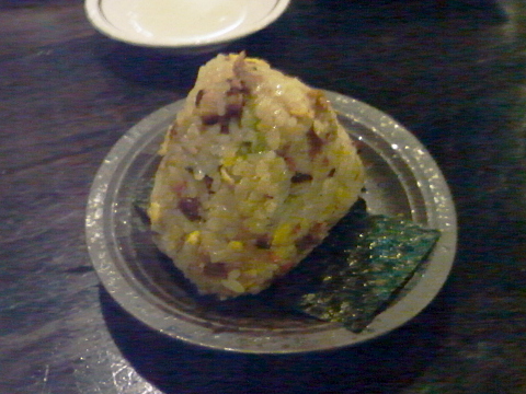 最後に、まだ食うか。女将さん特製「おにぎり」。チャーシュー入りのチャーハンおにぎりです。たぶん、この日限定・・・かな。