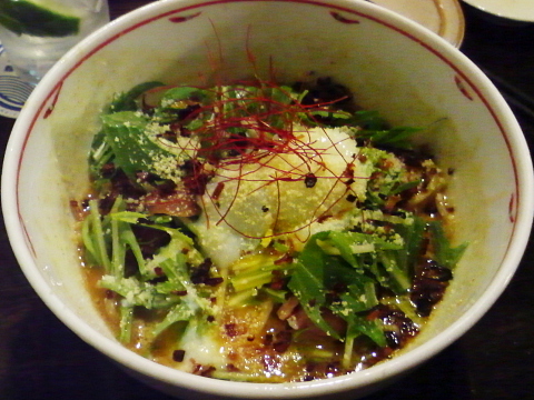 「温泉玉子とカレーの和えそば」の方は、カレーのスパイシーな風味が何とも言えない和えそばで、それに温泉玉子が加わることで、とってもマイルドな仕上がりです。摘みに最適かなあと思いますが、スパイシーさで香りなんかは感じられなくなるので、香りや微妙な味を楽しみたいときは、避けた方が良いかも。