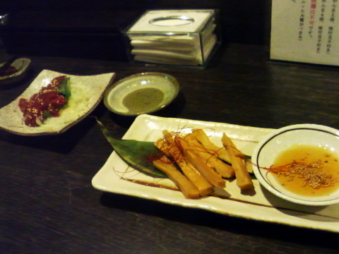 カクテルナイトではあったのですが、肝心のニイサンが仕事の都合で1時間半ほどの遅刻だそうで。とりあえず、ビールとメンマで時間繋ぎを。っていうか、1時間半、誰も来なかったらどうしようか、と(^^;