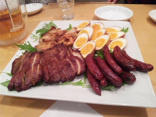 まずは、前菜の「おつまみ盛り合わせ」。とは言え、ただそのままではありません。バッチリ、燻製になっています。これがまた、ほどよい燻香で食欲をそそります。