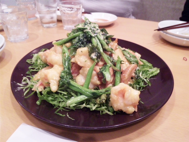 最後に「海老とフライドポテトのマヨネーズ和え」。海老とマヨネーズの相性って抜群ですよね。海老とフライドポテトのコンビでもうお腹一杯。