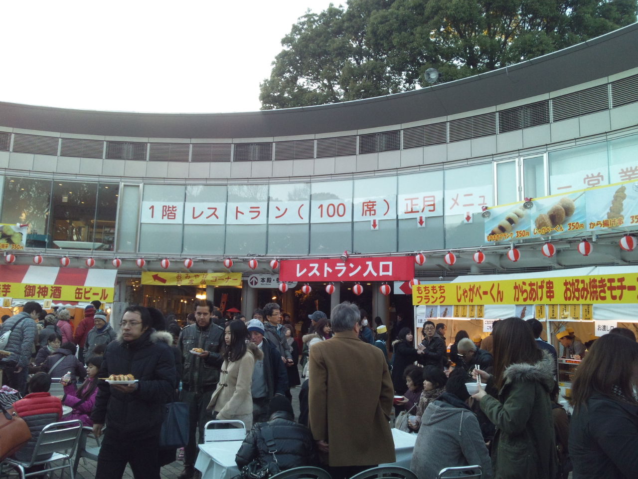 明治神宮は、中にある文化館に直営の食堂が入っていますが、三が日は多くの参拝客がここで小腹を満たすため、建物の外に仮設店舗を設置して対応しています。でも、それでも追い付かないほど物凄い賑わいです。流石明治神宮。