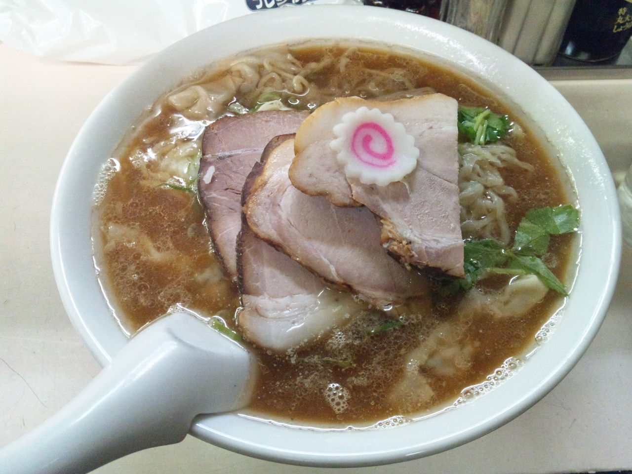 2014年09月11日 国味ラーメン@湯河原 チャーシューワンタンメン(950円) 県西地域を代表する地ラーメン「小田原系」。 その発祥は本当は湯河原であり、味の大西です。こちらは、その味の大西出身のお店。 地元では、本家よりもこちらが好きだという人も多いです。 店内は広く、カウンター席、テーブル席及び座敷席があります。 家族連れも多く、地元密着のお店です。 この日はスープがちょっと薄かったかな。 脂と化学調味料が織り成すコクはあったのですが、全体的に薄い印象でした。 麺は、勿論室伏製麺。あの平打ちの縮れ麺。 懐かしい。美味しいです。 チャーシューもワンタンも安定の旨さ。 小田原系は、具が美味しくないとね。 今度は久々に本店に行ってみるかなあ。ごちそうさま。 322杯目/2012年 【お店詳細(食べログ)】 国味ラーメン 昼総合点★★★☆☆ 3.3 関連ランキング:ラーメン | 湯河原駅 「足柄下郡湯河原町」カテゴリの最新記事 < 前の記事次の記事 > コメント コメントフォーム 名前 コメント 評価する リセット リセット 顔 星 投稿する 情報を記憶 トラックバック