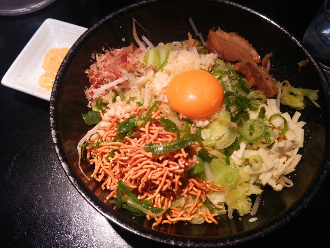 その他、鰹節、キャベツ、ネギ、もやし、卵黄が乗っています。