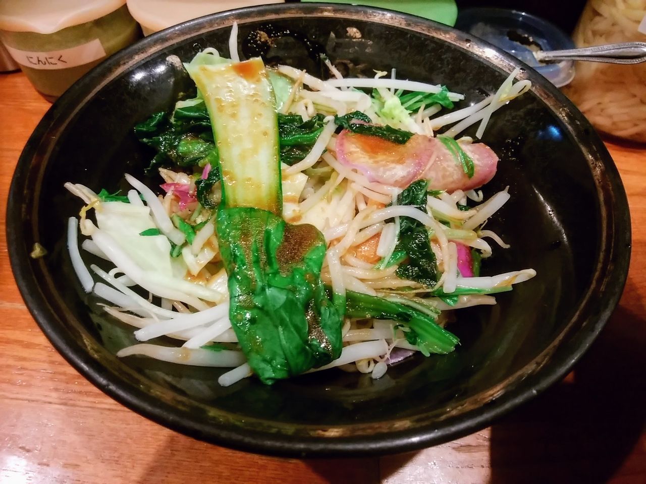 最初は野菜だけ。その後は少しずつ丼に移してラーメンと。この野菜がなかなか豚骨スープとよく合います。