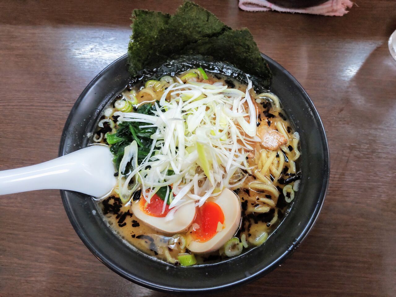 焦がしネギの風味が良く、これで完成された一杯。家系ラーメンには豆板醤を入れる派の私ですが、これは入れないほうが香りが立って好き。